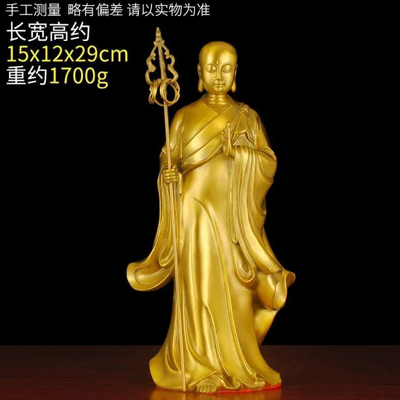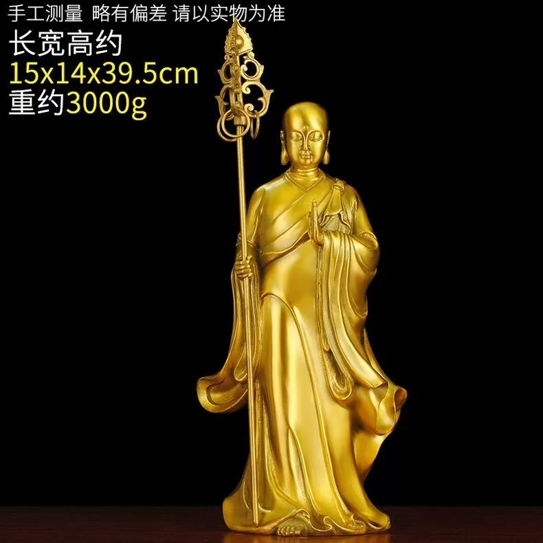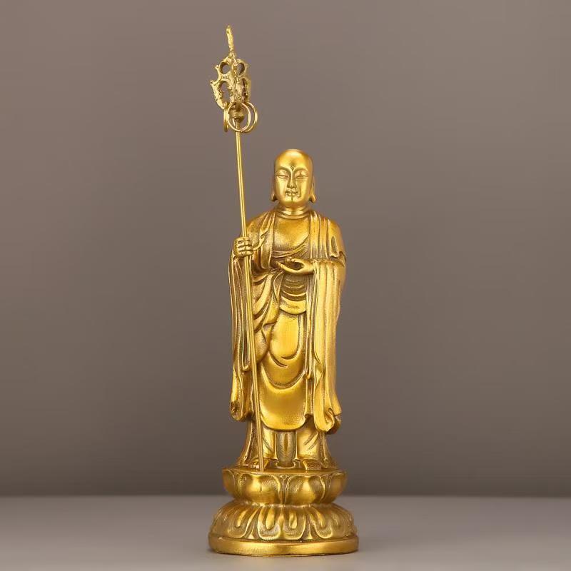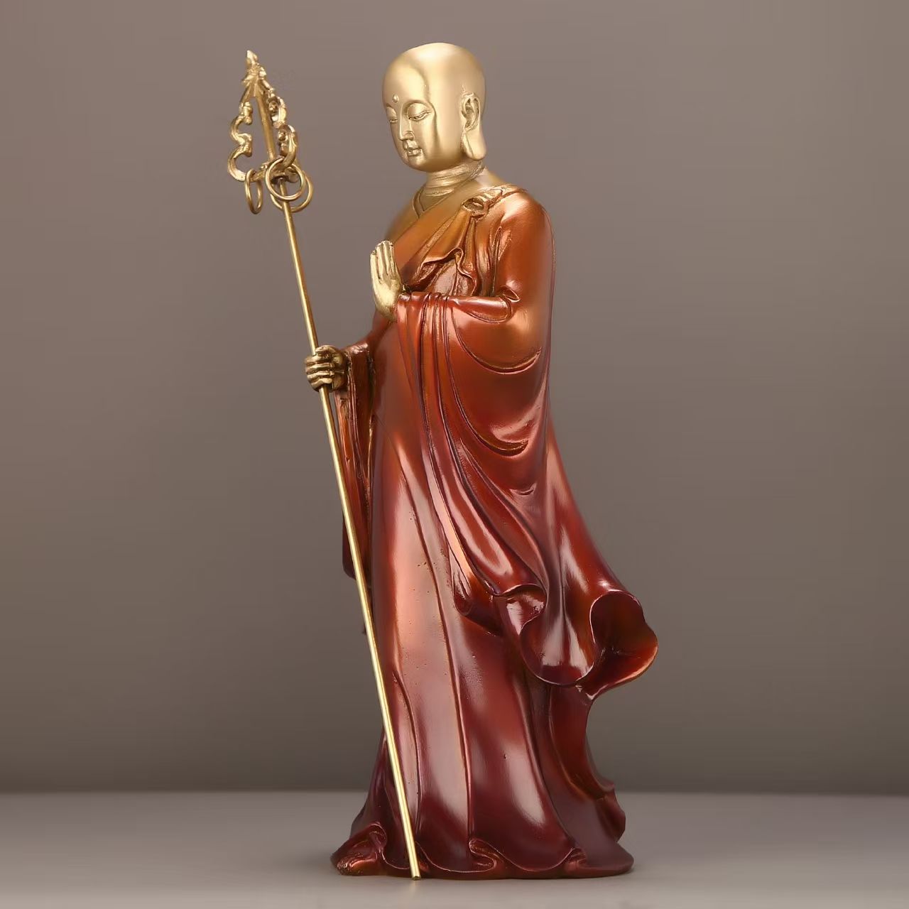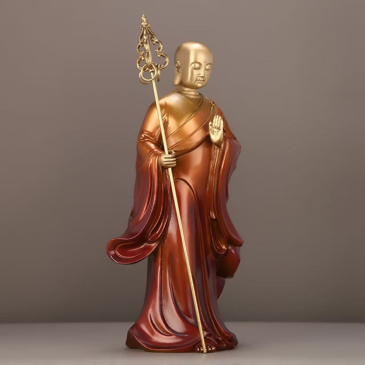 This exquisitely detailed statue depicts Ksitigarbha Bodhisattva (also known as Earth Store Bodhisattva – 地藏菩萨), one of the most revered figures in Mahayana Buddhism. Revered for his profound vow to deliver all beings from suffering, especially in the lower realms, Ksitigarbha is a symbol of compassion, filial piety, and unwavering determination. This figurine captures him in a classic standing posture, radiating serenity and spiritual power.