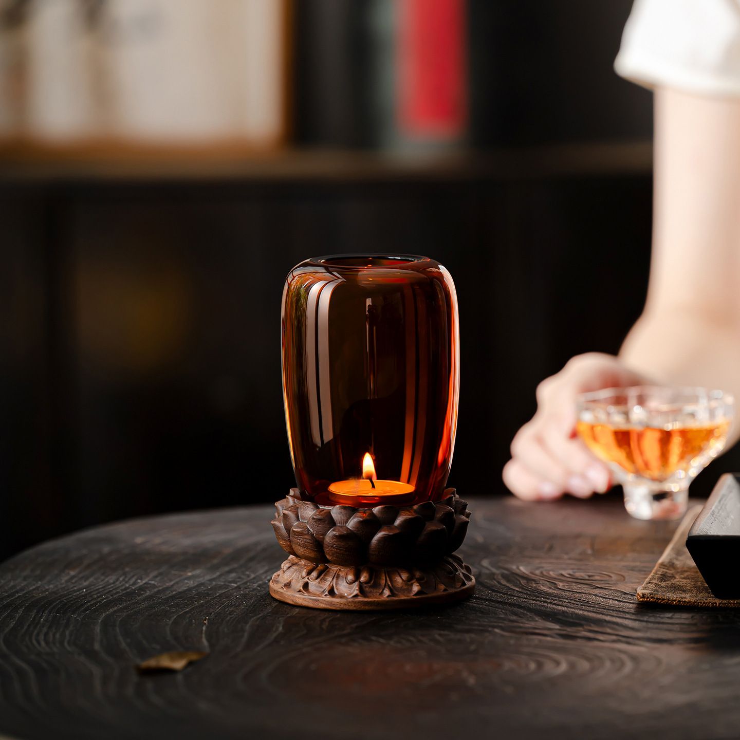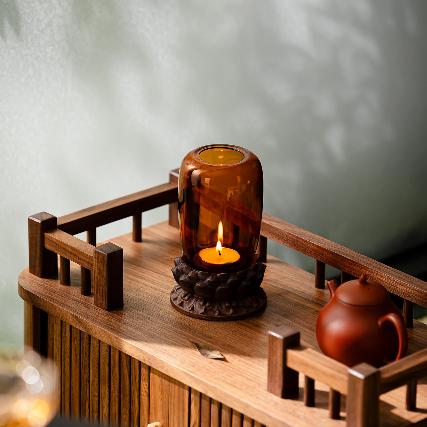Zen Chinese Antique-style Lotus Candle Holder & Incense Burner with Windproof Cover & Solid Wood Base for Tea Room & Meditation Space